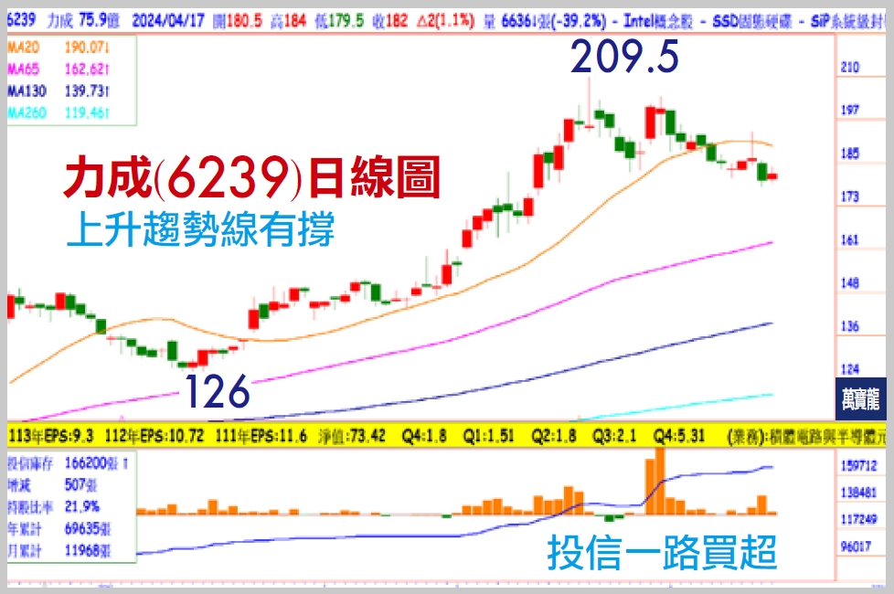 力成去年第四季受惠客戶拉貨,加上蘇州廠處分利益挹注業外,單季獲利39.66億,EPS5.31元,而且毛利率也是呈現逐季成長,Q4為20.54%,累計全年稅後獲利 80.09億,EPS10.72元。力成去年邏輯晶片營收比重38%、SiP/Module 8%、NAND29%以及DRAM 25%,由於記憶體報價走揚,加上AI需求帶動高頻寬記憶體(HBM),公司也表示接獲日系客戶訂單,研判比重超過一半營收的記憶體將大舉推升獲利。而且邏輯晶片也因產業復甦與AI趨勢成長可期,日後又有面板級扇出型封裝加持,預估2024年EPS上看13元,本益比僅14倍,公司將配發7元現金股利,殖利率仍有3.8%,配合投信持續買超,逢低可積極布局。