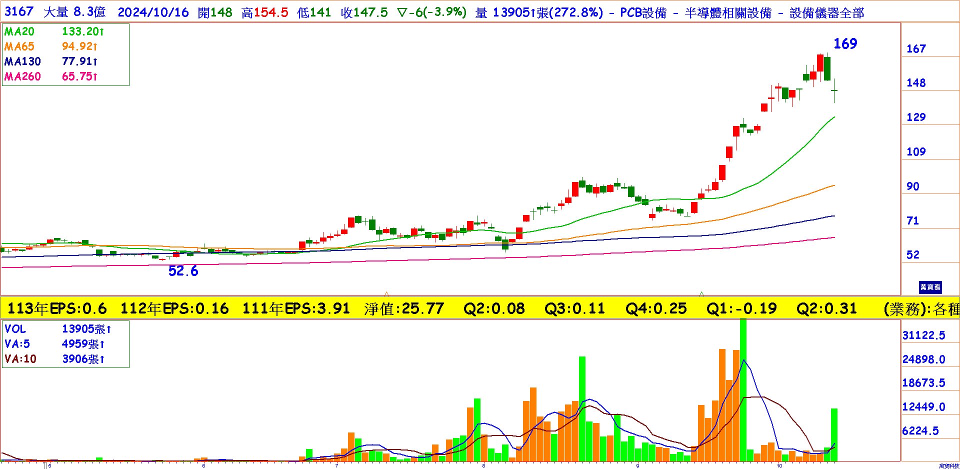 操作短期強勢股的邏輯依然,技術線型要放在第一優先、題材次之,營收等基本面只能排在第三;若遇到起漲與主升階段,直接拉一波的走勢會很驚人。例如大量(3167)從9/12以漲停的長紅K站上5日線與10日線後,就一路沿著這二條線走漲;強勢股有壓回到短均附近的紅K都是買點,例如9/26以及10/7都是大量的壓回5日線的買點。