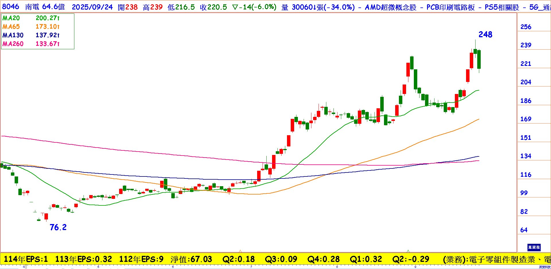 並且南電也是台塑集團旗下高階印刷電路板及IC載板製造廠,近期季底集團作帳態勢明確,包含南亞科(2408)、南亞(1303)、台勝科(3532)也都接連大漲,南電受惠AI、5G、800G等新興應用,8月營收38.07億,月增5.15%、年增22.91%,為28個月以來新高;累計前八月營收254.69億,年增18.77%,ABF與BT載板需求持續增溫,南電明年有機會在更多高階AI伺服器專案中扮演關鍵角色,加上T-Glass新產能陸續釋出,