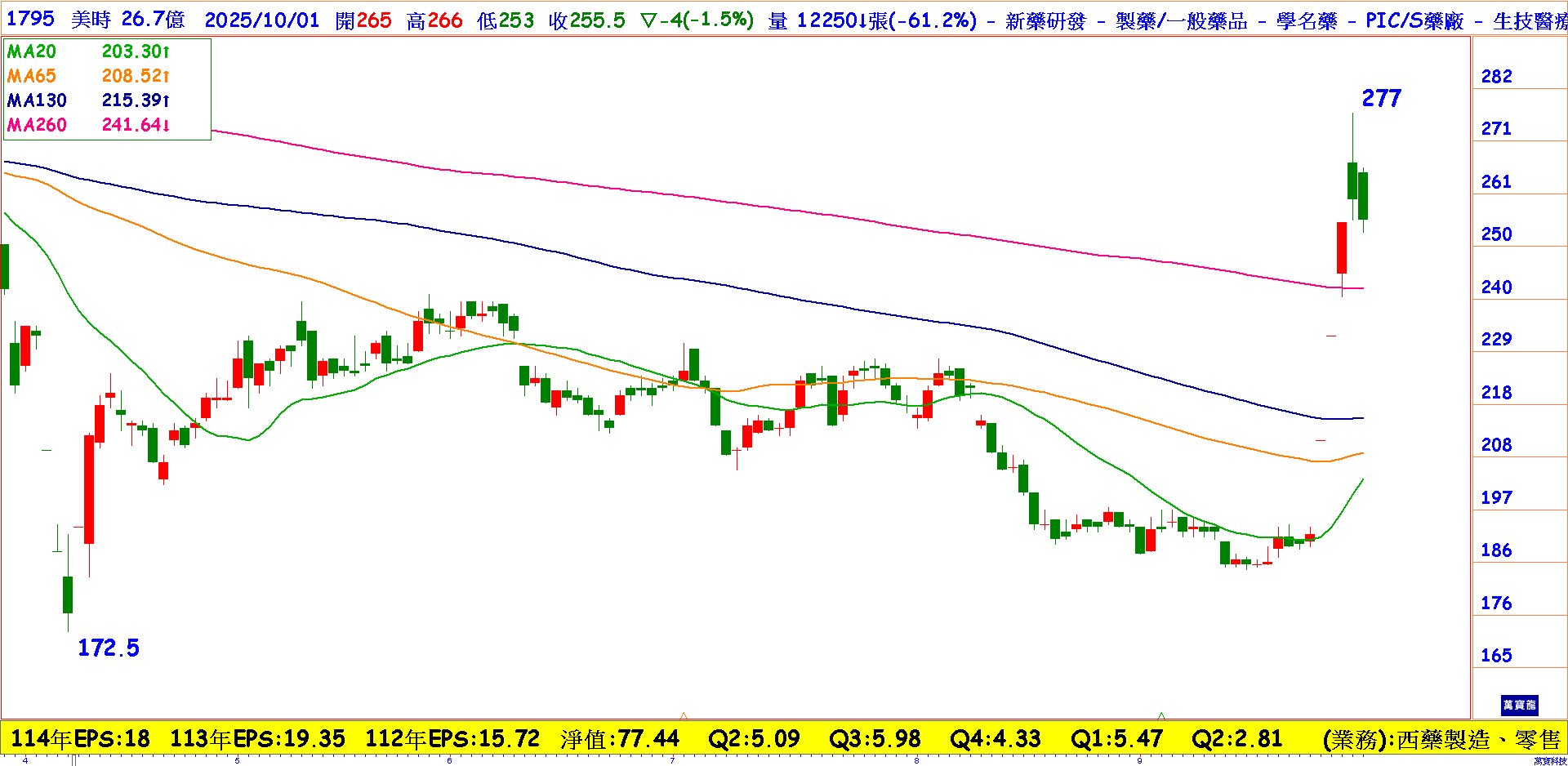 美時(1795),美時宣布,將以6.58億美元(約新台幣200億元)收購New Alvogen Group Holdings, Inc.(NAGH)100%股權,進而持有位於美國紐澤西的Alvogen US。此項收購將使美時一躍成為全球前20大專科製藥公司,並預期合併後的營收及稅息折舊及攤銷前利潤(EBITDA)將增加一倍。預估,明年整體營收較今年水準繳出近倍成長,全年營收應該有350億元水準,每股盈餘預估則會落在25-35元間。本益比有拉高的空間。