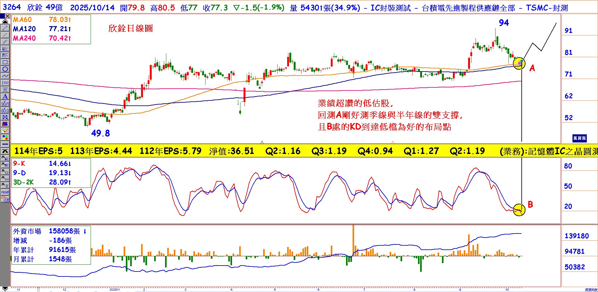 欣銓Q2營收34.24億較Q1的32.13億、季增6.5%,但營業毛利、營業利益分別為12.44、9.04億較同期的11.28、7.77億各季增10.3%、16.34%優於預期,業績之所以好,主要是公司搭上雲端服務供應商(CSP)自研AI晶片熱潮,加上晶圓大廠委外測試訂單挹注,此為業績大成長的主因,又取得美系網通晶片大廠的AI測試訂單,且可望逐季放量成長,所以Q3營收35.925又較Q2的34.24季增4.9%又優於預期,欣銓產品集中在網通/通訊/通用/MCU、車用/安控,消費電子只佔個位數,故毛利率逐季成長,尤其CSP皆積極建置資料中心,並投入發展自研晶片,以帶動新一波特殊應用晶片(ASIC)大需求成長,欣銓卡到此大商機,估今年EPS 5.3~5.6,10/13收78.8以5.4換算本益比只有14.6倍,配合圖中KD指標已經到達低檔且外資持續買超,建議積極布局。