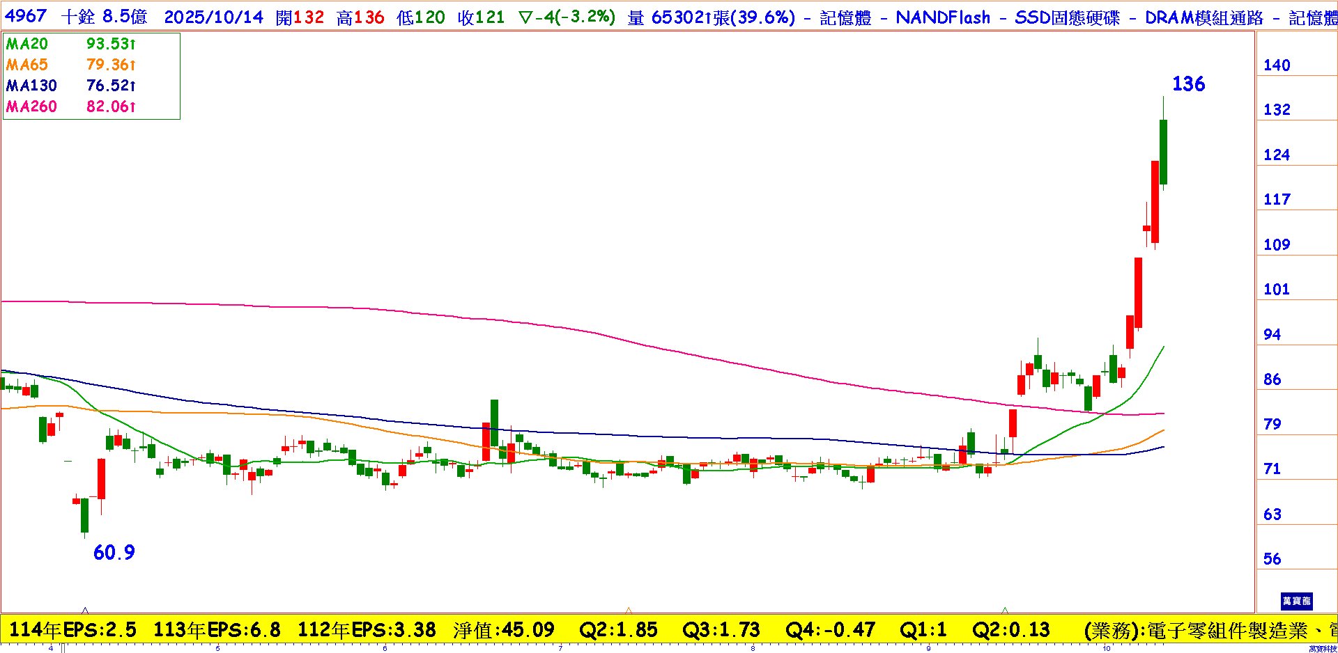 目前十月才過了三分之一而已,這些事情都還有機會被阻止發生,個股以政策股、軍工股、原物料股相對抗跌,加上美國總統川普可能又政策髮夾彎,並且10/16台積電法說與之後美國科技財報週,短期急殺後強彈機率不低,而本周推薦的記憶體模組廠十銓科技(4967) 9月營收19.46億,月爆增1.08倍,並較去年同期成長64%,Q3營收為41.64億,季減6.1%,9月營收成長主要受惠於品牌訂單與B2B專案表現所帶動。