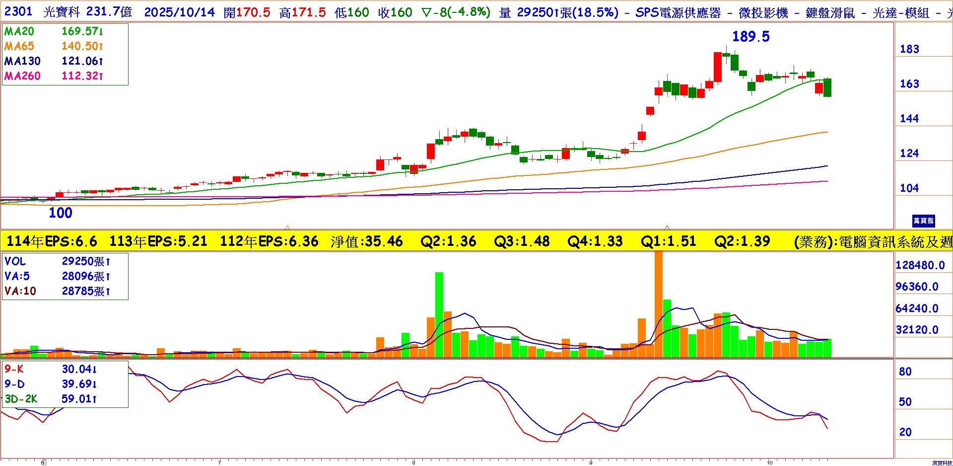 光寶科(2301)上半年EPS2.89元,Q3營收448.9億優於Q2的404億,由於AI電源持續成長,未來隨著Power Rack產品開出,滲透率有望顯著提升,尤其是Power Rack部分,今年第四季將出貨54V 500KW的樣機產品給客戶。在高壓電源機櫃(HVDC)部分,預期2026年下半年開始出貨400V產品,2027年出貨800V產品。至於液冷部分,今年第四季確定開始出貨L2A Sidecar,規格介於100~150KW,由於Sidecar毛利率有30%以上,將可帶動產品組合轉佳。預估2025年EPS6.2元,2026年在新產品加持下,EPS上看8.5元,本益比20倍,相較台達電的39倍本益比低許多,研判將有補漲空間。技術面只要守住9/11大量區低點156.5元,多頭攻勢可望持續,且MACD在零軸以上,一旦法人賣壓告一段落,可逢低布局。
