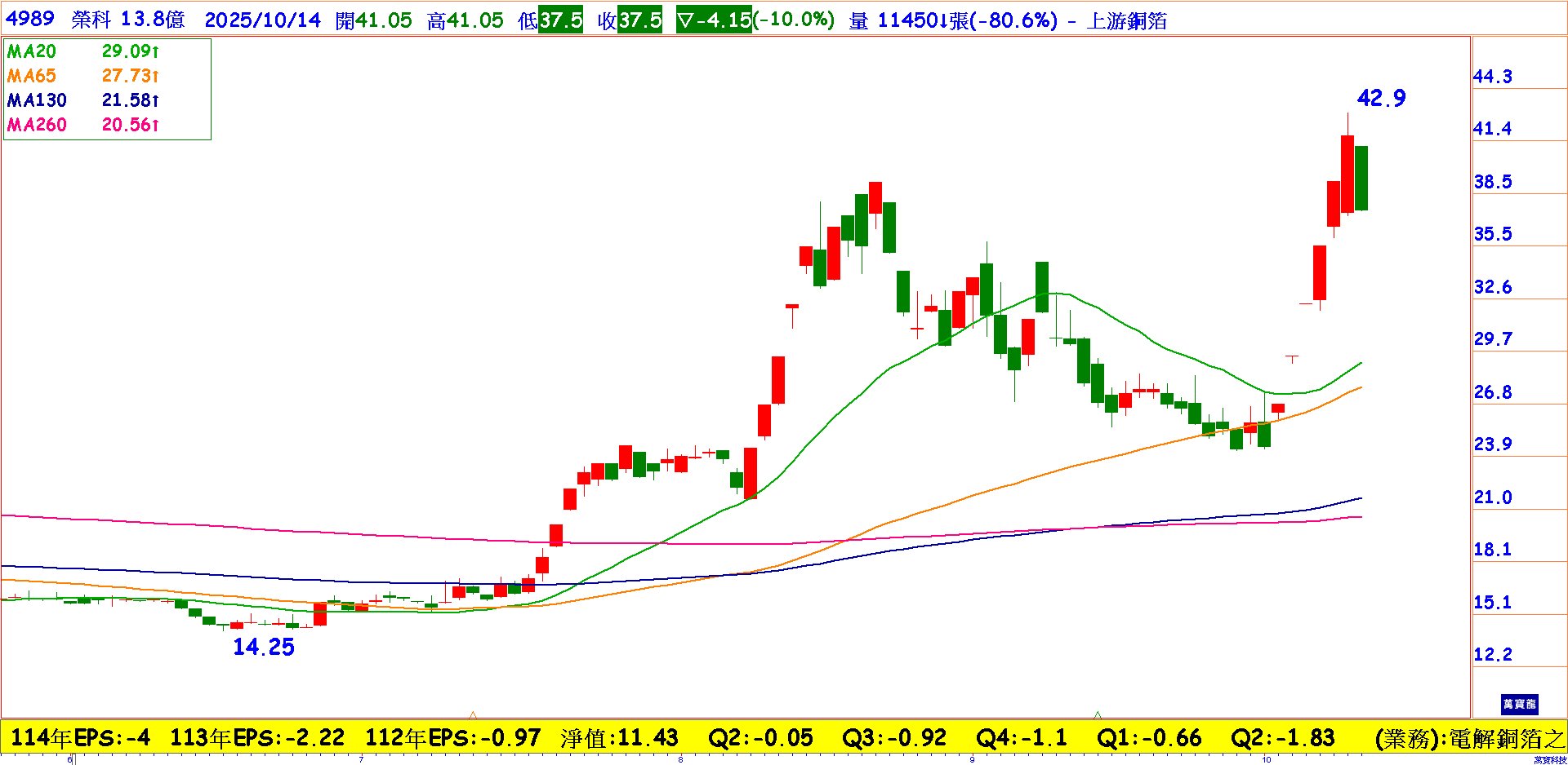而榮科由傳統 HTE,到 RTF/VLP(低粗化),再到HVLP(超低粗化);2019年量產VLP/RTF,2024年完成高端2RT認證,2025年取得HVLP國際客戶認證是目前AI伺服器當中最需要的銅箔材料,股價近期連續拉出5跟漲停,有比照金居股價的氣勢。
