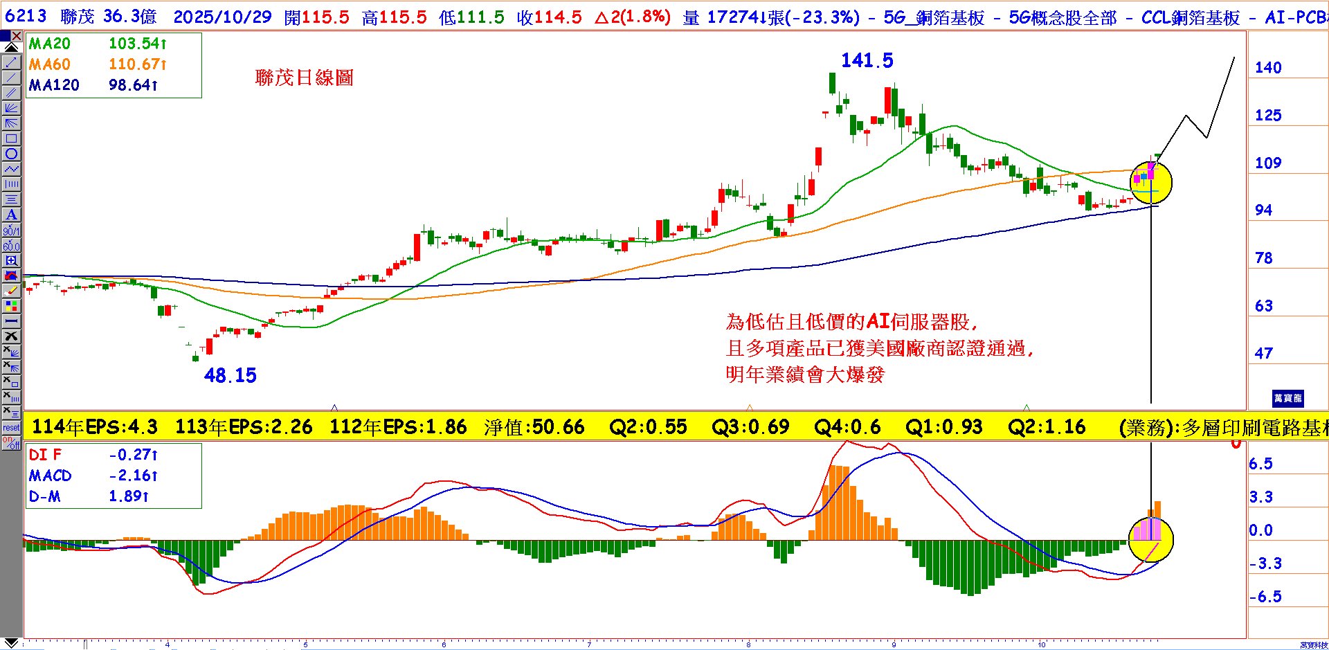 上週國際股市傳出美中貿易談判有好消息,使日、韓、美股市都大漲皆大幅創新高,台股也大幅創新高到28196、到10/28收27949,但選股不選市,因台股中低估股非常多,如美國的AI:谷歌、META、亞馬遜、博通、甲骨文、輝達、微軟、DELL及蘋果、特斯拉形成良性的輪漲,且國際股市的DRAM:美光、海力士都出現大漲幅帶動台灣的南亞科、華邦、旺宏、力積、威剛、群聯的更大漲幅,但DRAM相關股漲到此漲幅確實相當大,如南亞科自24.7漲到131.5,已大漲432%,遠大於做DRAM及HBM的美光自61.5漲到220.98、漲幅259%為大,DRAM漲到此投資人喜歡做當沖,然美股的AI伺服器輪漲會帶動台股低估AI伺服器大漲,如貿聯、台光電、奇紘、勤誠、良維、光寶科、健鼎、台燿、聯茂、建準、智邦、金像電、廣達、緯創、鴻海、矽格、欣銓及被動元件的國巨、華新科、立隆、日電貿、興勤、禾伸堂、佳邦…及富鼎、日月光、力成的輪漲,另達電、致茂、川湖、旺矽…可作當沖。