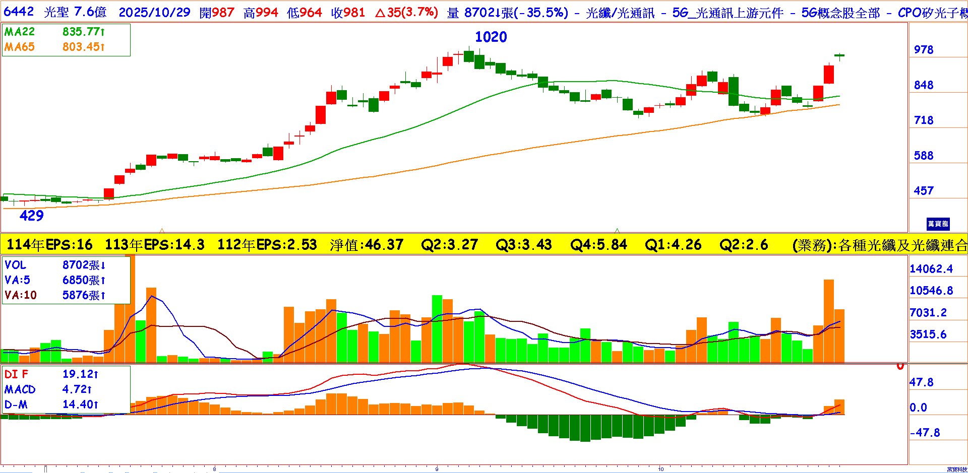 光聖(6442)在資料中心領域布局完整,涵蓋cassette、光纖fiber與cable產品,並持續從288芯技術提升至6,912芯,與客戶共同進行客製化開發。轉投資的合聖則專注於CPO關鍵元件,包括FAU(光纖陣列)設計與ELS(外部光源)模組。目前合聖已投入400G與800G光收發器量產,並同步推進1.6T規格的POC專案。合聖計畫於2026年公開發行,2027年登錄興櫃,在未掛牌前,光聖仍將成為市場上之焦點。光聖第一季營業利益有3.82億,第二季倍數跳升至7.94億,上半年EPS僅6.85元,主要是第二季業外損失達4.97億,由於9月營收高達10.45億,月增率61.9%,年增率85.99%,有助第三季獲利揚升,今年預估EPS16元,2026年EPS有機會挑戰32元,獲利機會呈現倍增。股價於季線之上打底成功,MACD翻紅且量能升溫,配合法人買盤回籠,研判股價將再次啟動Q3大漲模式,可逢低分批布局。