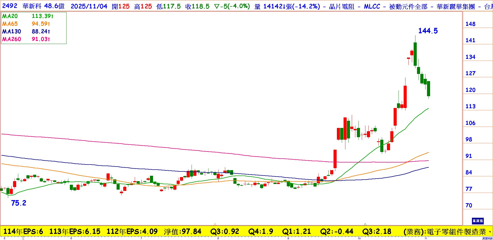 AI 伺服器與傳統伺服器或消費性電子產品相比,對被動元件的需求是呈數倍甚至數十倍的跳躍式增長,其中需求用量呈現爆炸式增長,一台傳統伺服器平均約使用 2,000 顆 MLCC (多層陶瓷電容器),但一台AI 伺服器由於需要支援多顆高功耗的 GPU,其 MLCC 用量可飆升至 2 萬顆以上,甚至有高階機櫃(如 NVL72 型號)的用量高達 44 萬顆以上,是傳統伺服器的20倍以上,另外,AI伺服器的高功耗也提升被動元件需求,隨著AI晶片(如GPU)的熱設計功耗(TDP)不斷提高(例如從1,400W升至2,300W),其對電源管理的需求更為嚴苛,進一步推升了高階電感和電容的需求量,需求面明顯上升也促使被動元件國內外指標股股價開始從低檔向上發動,另外,庫存回補也是報價上漲的關鍵,經過前兩年消費性電子需求疲弱導致的庫存去化,目前被動元件庫存水位已回到健康區間。在高階 AI 和車用需求的帶動下,電感、高階 MLCC 等產品已傳出交期延長或漲價的消息,而這也反映在股價的表現上,重點指標股來說,日本村田製作所(6981.JP)十月以來股價持續大漲,台股的國巨*(2327)在今年度股價分割後也呈現繼續向上的行情走勢,華新科(2492)公告第三季獲利2.18元,明顯觸底向上,而股價也呈現長線低基期開始向上,台灣主要被動元件大廠積極轉型並佈局高階應用,成為AI趨勢的主要受惠者,操作重點還是觀察台被動元件基期仍低,若未來持續走出產業向上循環,大波段行情就相當可以期待,我也會繼續在我的Line: @marbo178幫大家追蹤,歡迎各位投資朋友加入錢冠州老師的Line好友。