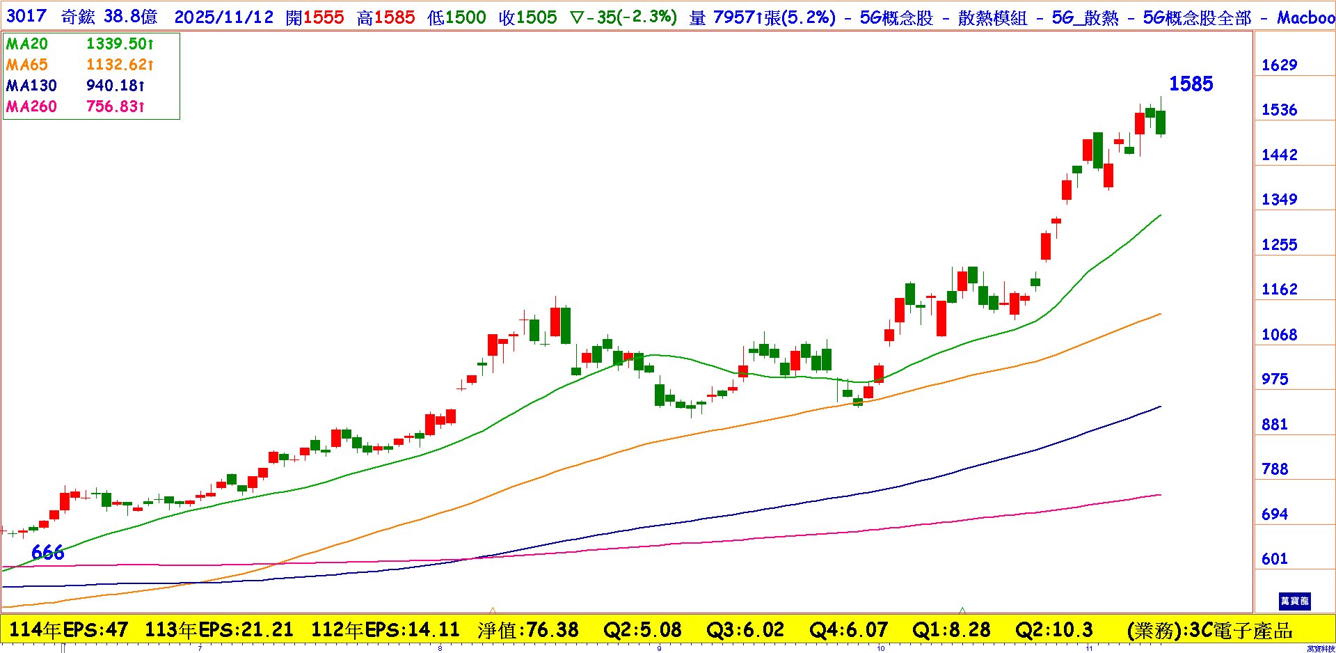 在第四季起GB300大量出貨之下,及2026年建置AI資料中心的浪潮開始,台灣廠商在全球AI供應鏈中具有不可取代的地位,預計將在2026年成為此波成長的最大贏家,為了應對 2026 年 AI 伺服器對液冷模組的爆發性需求,台灣主要的散熱供應商都已積極進行產能擴張,主要集中在高價值的冷板(Cold Plate)和 CDU (冷卻液分配單元)與水冷轉接頭(QDC)上,奇鋐(3017)與雙鴻(3324)積極擴大液冷產線,作為AI液冷模組的兩大領頭羊,奇鋐與雙鴻的擴產聚焦於滿足雲端服務供應商(CSP)的巨額訂單,兩家廠商都持續將原本生產氣冷產品的舊有產線,逐步轉換或升級為液冷產品產線,提高整體高階產品的產能比重,預計2025年底至2026年初,新的擴產專案將陸續到位,特別是針對Cold Plate(水冷板)的焊接與組裝能力,以確保能消化 NVIDIA B100/B200 等平台帶來的巨量訂單,股價表現上,散熱雙雄也明顯保持多頭架構並延續月線向上挺進,奇鋐(3017)持續往1500元整數關卡前進,而雙鴻(3324)也保持在千元大關之上,多方行情並未結束,法人買盤的積極也促使股價無畏外在行情波動而走出穩健偏多的道路,另外,液冷散熱模組的關鍵元件,富世達(6805)的水冷轉接頭也在2025年下半年起開始明顯貢獻營收,在AI伺服器應用中,水冷轉接頭(QDC)扮演著如同「生命線」的角色,決定了液冷系統的可靠性、維護效率和資料中心的安全,避免漏液的狀況危急整個AI伺服器機櫃,而奇鋐子公司富世達的水冷轉接頭產品即隨奇鋐直接打入四大雲端業者的供貨體系,在台灣股市中,僅有較少的純粹只做「水冷快接頭」的上市櫃公司,富世達(6805)積極切入水冷機構件和AI伺服器專案,在其專案中將大量用到水冷快接頭,並透過母公司奇鋐(3017),一起打入四大雲端業者的AI伺服器供應鏈,水冷快接頭是 AI 伺服器液冷散熱系統中價值高、技術門檻高的零組件。隨著液冷在 2026 年成為主流,相關供應鏈將持續受益,而富世達(6805)也在外資及投信的買盤加持下,於11月上旬攻抵1520的高價,外資國泰大和將富世達(6805)的目標價調高到1666元,多方趨勢持續看好。