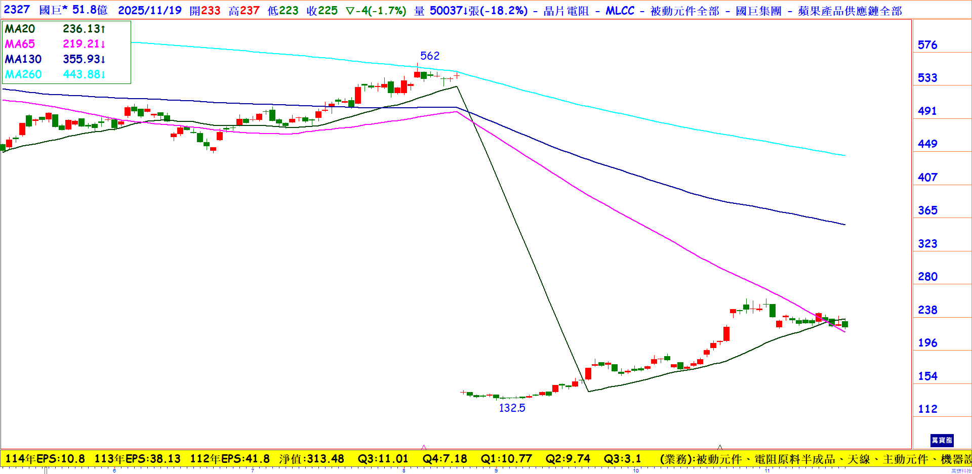 國巨Q3的毛利率36.2%、營利率22.9%雙增,單季獲利站上12季度以來新高,Q3 EPS 3.1、前三季EPS 8.2元表現非常亮麗,公司表示Q4營收與Q3持平,雙率仍然可微增。在未來產品組合轉價下,毛利率、營利率持續震盪走高,呈上升趨勢,10月營收113.52億在大陸十一長假下表現優於預期。國巨表示Q3業績這麼好來自人工智能及高階應用相關產品的需求,提高稅後淨利,而Q3來自美國營收比重達30%,且生產鉭質的營收就在基美廠,受益已二度調高售價獲利可在進一步成長,另帶動電腦及周邊裝置與電信通訊,雖有季節性下滑,但趨勢仍向上。在芝浦併購方面,目前持股比率已經達87.3%,預計2026年Q1取得100%控股,在Q4起可正式認列芝浦營收及獲利,未來可出現較大的成長性,加上MLCC的需求也強勁,及電感也受益未來調漲價格,估今年EPS可達11.2、明年EPS可達14~15元,以11/18收229換算本益比20.4倍(以今年EPS 11.2換算)偏低且技術面KD已經在低檔打W底,未來上漲可期,建議逢低布局。