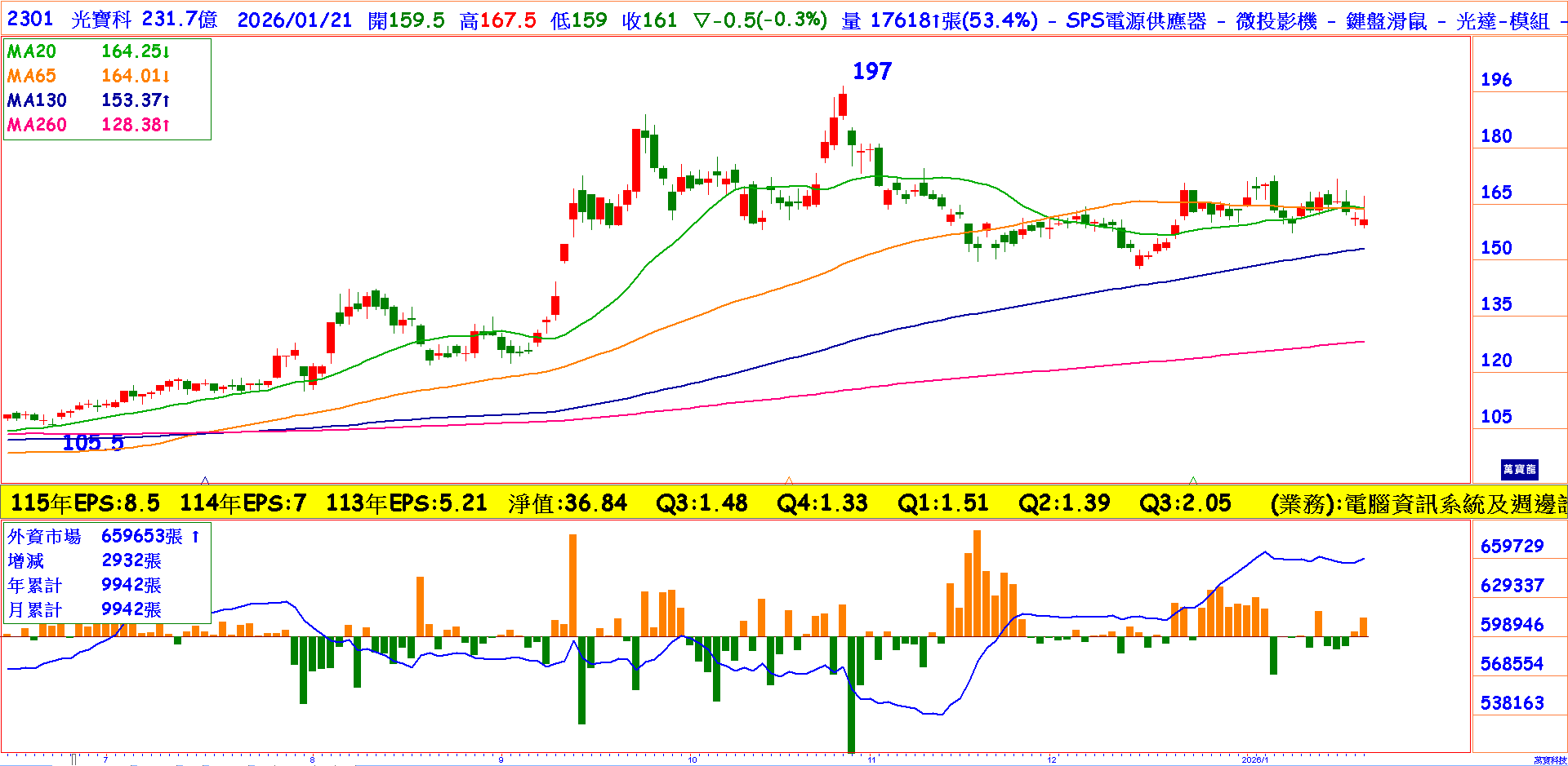 電源雙雄的達電已創新高,去年Q3毛利率34.9%跟Q2的34.5%歷史新高只差0.6%,另一大潛力股光寶Q3毛利率跳升到25%創歷史新高,較Q2的22.1%大增2.9%,顯示電源雙雄成長力道強勁。光寶科有三大事業部門:雲端及物聯網;去年Q3的營收214.56佔營收48%,營業利益更暴增到33.29億、較Q2的18.69億成長78%,此部門含資料中心、伺服器、網通設備、AI與物聯網智慧裝置及智慧影像方案等產品線。受惠新一代AI伺服器電源、雲端運算部門及電源管理系統BBU出貨順利,尤其電源管理系統、BBU及33KW Power Shelf需求大幅提升。另兩部門:光電部門Q3佔總營收16%、營業利益6.06億、此部門涵蓋光電半導體、汽電和道路智慧化系統。另一部門消費電子Q3營收164.57億佔36%、此部門含筆電、工作站、平板電腦、桌上型電腦、消費電子產品,尤其低軌道衛星電源表現特別強勁,由三部門看出成長幅度最大在與AI有關的雲端,尤其在電源更具爆發力,去年Q4營收443.57億只季1.2%,又因輝達今年下半年切入RUBIN,使光寶展現爆發力,估今年EPS 8.5元,以1/21收161本益比只有18.9倍,嚴重低估。