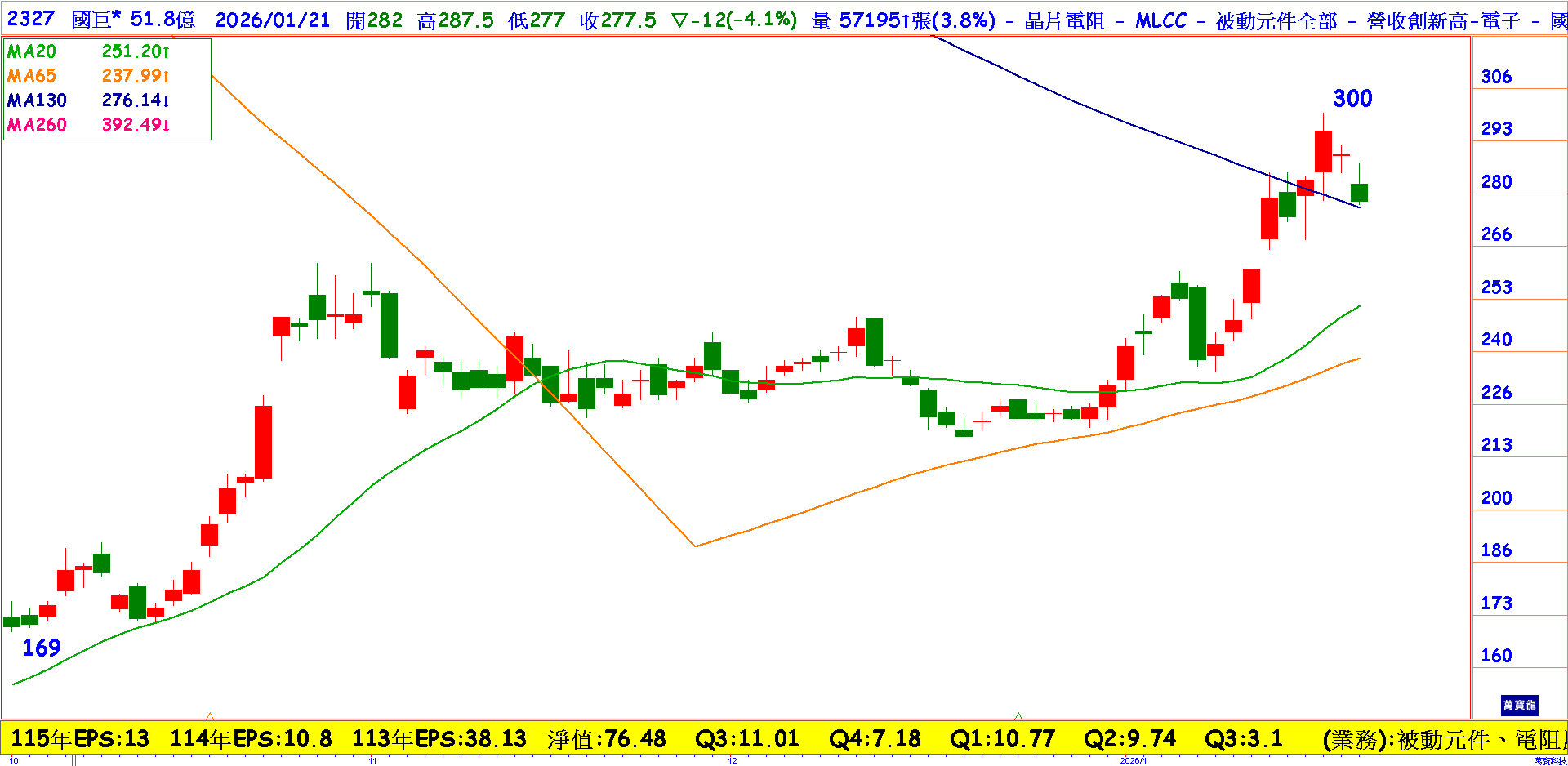 過去被動元件被市場認為是「景氣循環」股,因為營收7成來自消費性電子的「標準品」。如今,經過幾年的體質調整,國巨的營收結構已出現黃金交叉:超過75%的營收來自「利基型產品」,這意味著,國巨的訂價能力與獲利能力不再完全受制於消費電子景氣的榮枯。即便手機市場疲軟,來自車用、工控、航太與AI的高階訂單,仍能支撐其毛利率維持在34%的高檔水位。今年EPS 有望挑戰15元,股價仍有高點可期。