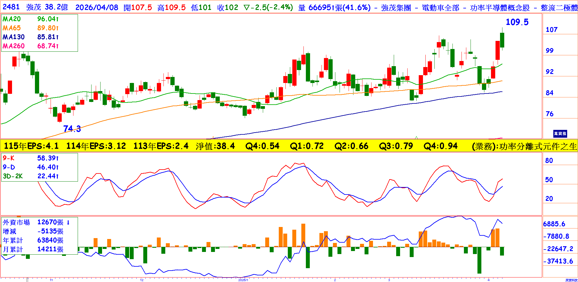 強茂訂單能見度已延伸至下半年,訂單出貨比(BB值)自去年10月起維持在1.2至1.4區間,故今年業績逐季成長可期。強茂去年EPS3.12元,毛利率連續3季走揚,顯示本業競爭力呈現拉高,2026年EPS有機會來到4.8~5.5元間,本益比僅19倍,近期三大法人悄悄布局,MACD也在零軸以上,呈現多頭架構,一旦柱狀圖翻紅,攻勢將更加犀利。此外,日、周、月KD全部剛交叉向上,同時也未到指標過熱階段。目前股價放量站上所有均線,月線與季線呈現黃金交叉,3月高點若突破波段行情可期,可將季線當作中長期多空分水嶺,月線不破可分批逢低布局。