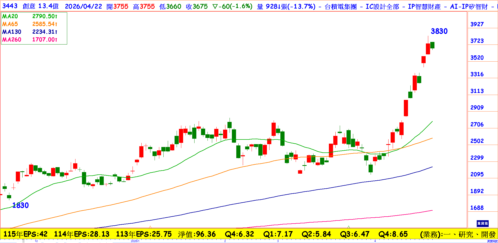 整體而言,創意憑藉完整ASIC設計與量產整合能力,成功卡位AI產業鏈核心。隨著AI5帶動新一波需求爆發,加上CSP專案與先進製程優勢,未來三年成長動能強勁。預估2026年EPS達45.17元,以40–84倍本益比評價,目標價高於3,800元,可中長期投資優勢股之一。