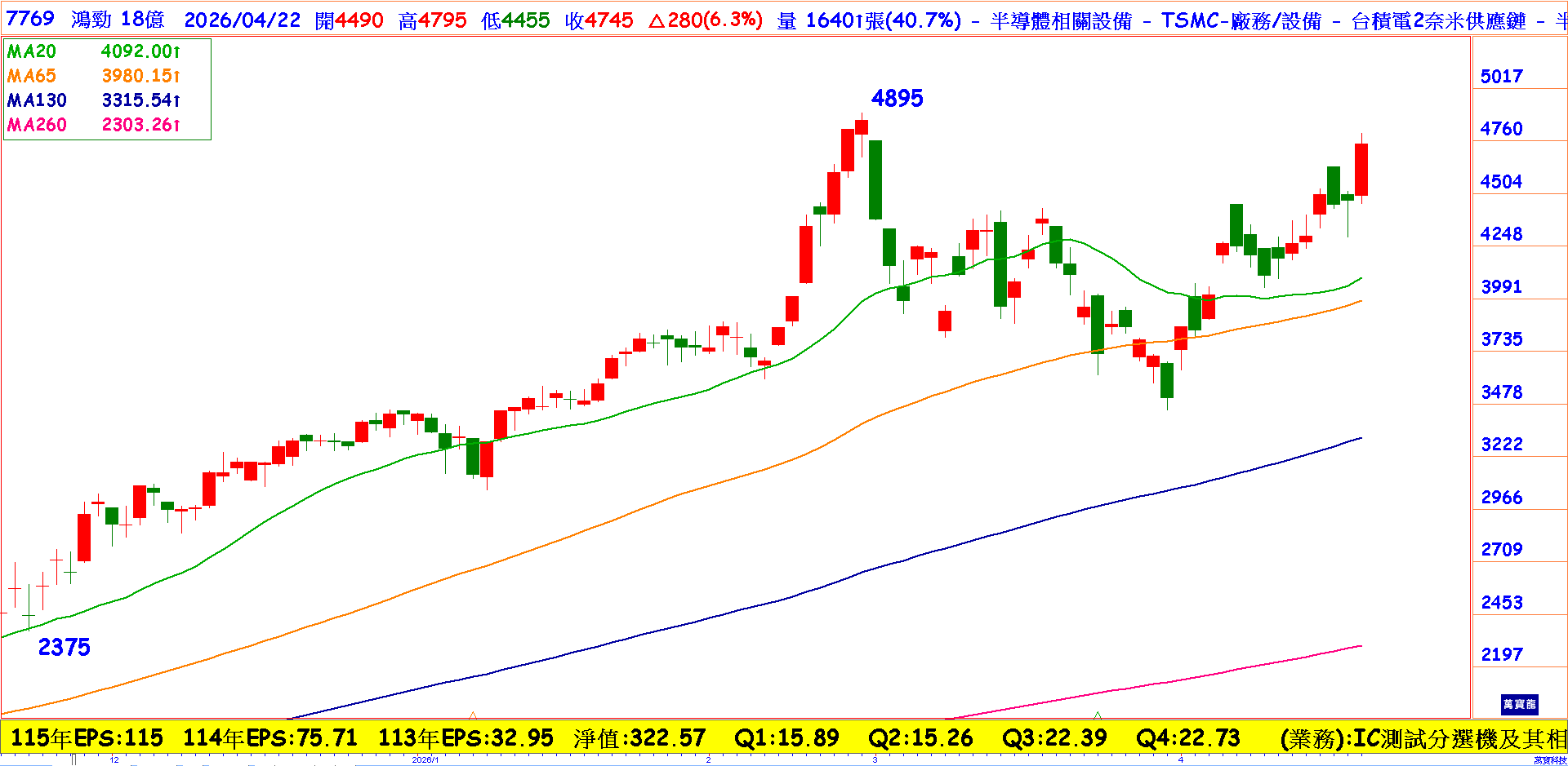 鴻勁2025年營收達302億元,年增幅達63%;毛利率56.54%、淨利率40.84%,EPS更高達75.71元,獲利表現於半導體設備產業中位居前段。2026年成長動能全面啟動,主要動能來自AI、HPC、ASIC等高階晶片測試需求,公司明確預期全年營收將至少成長100%。第一季訂單能見度與去年全年表現截然不同,也意味著產業正式邁入新一輪成長週期。