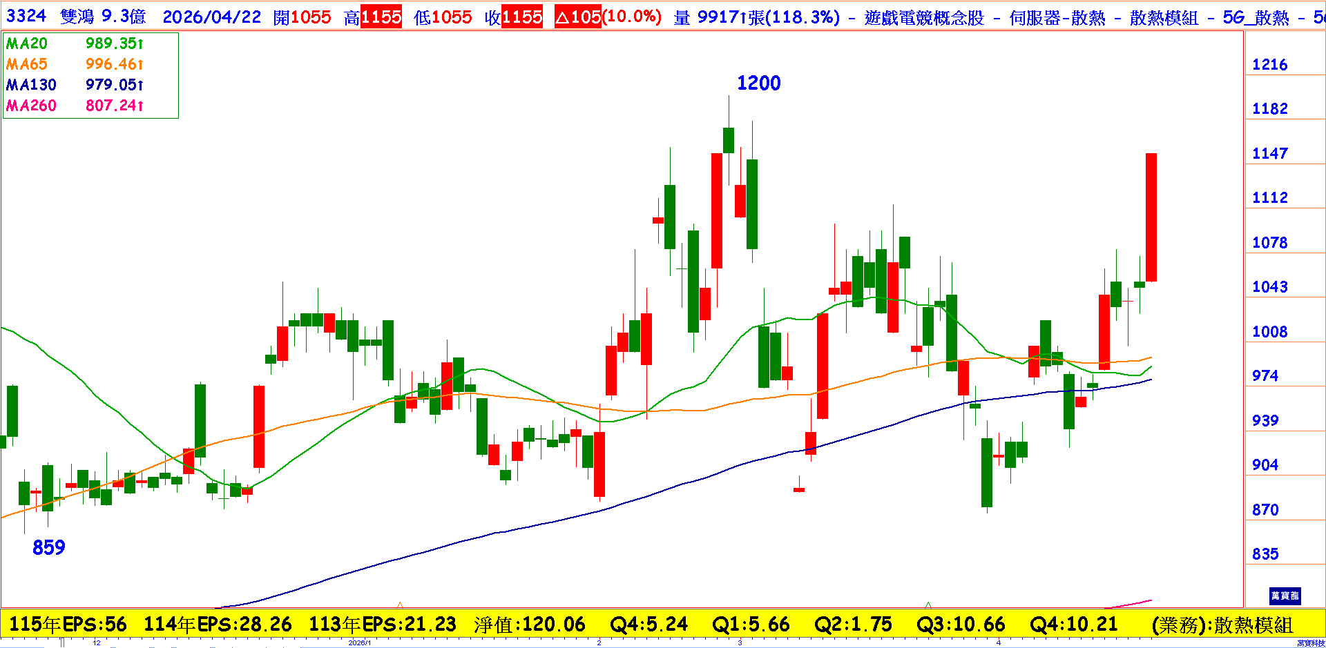 雙鴻的股價跟競爭對手奇鋐差異甚大,奇鋐的股價已經飛龍在天,來到2500附近,但雙鴻依然在千元附近徘徊,到底雙鴻的股價有沒有機會呢?